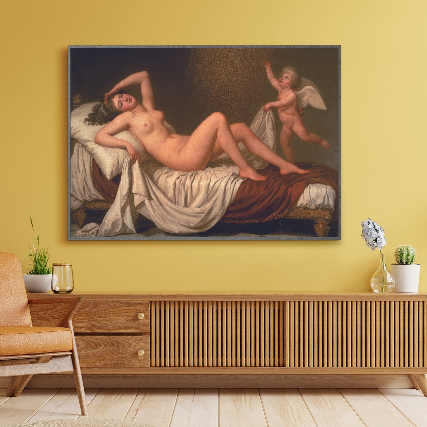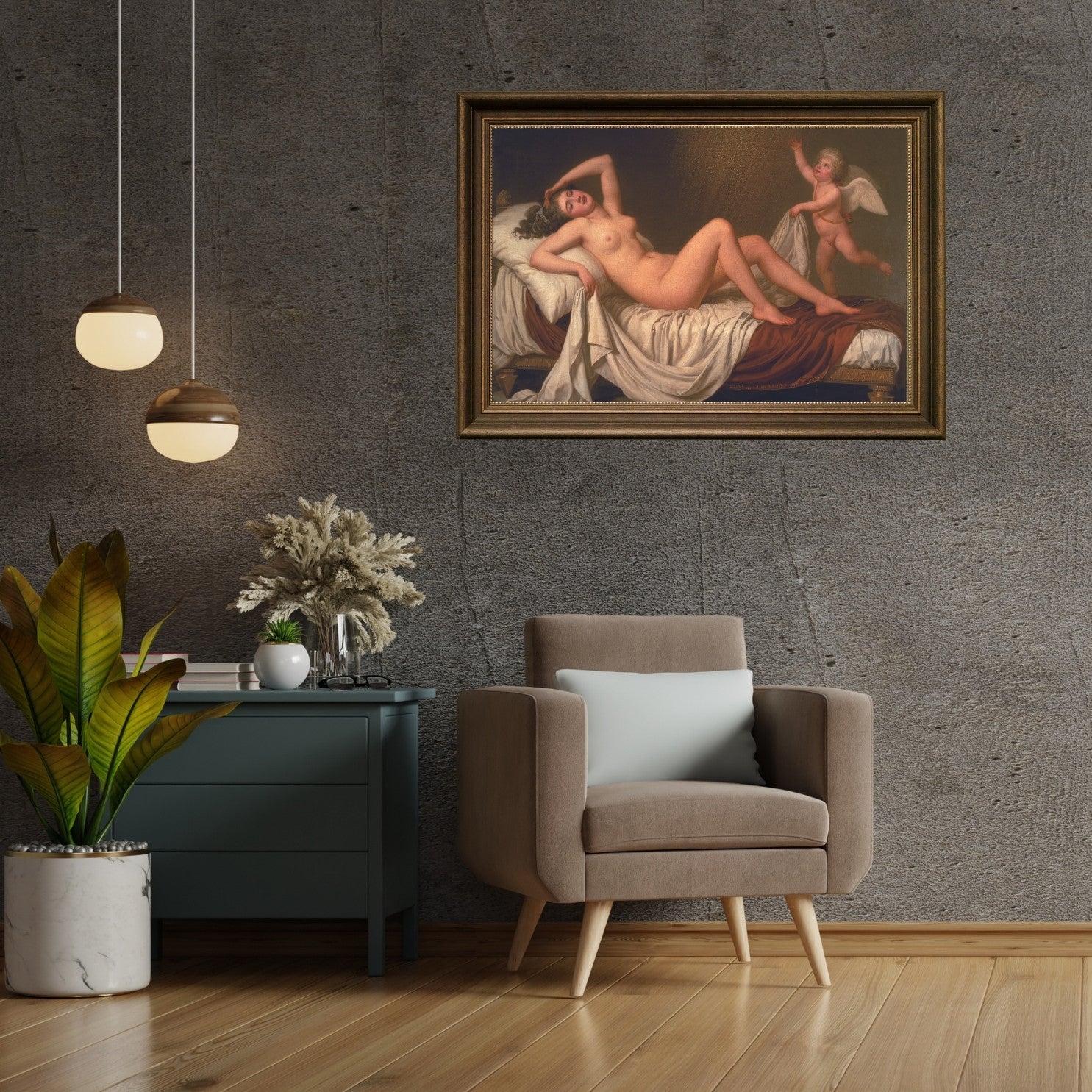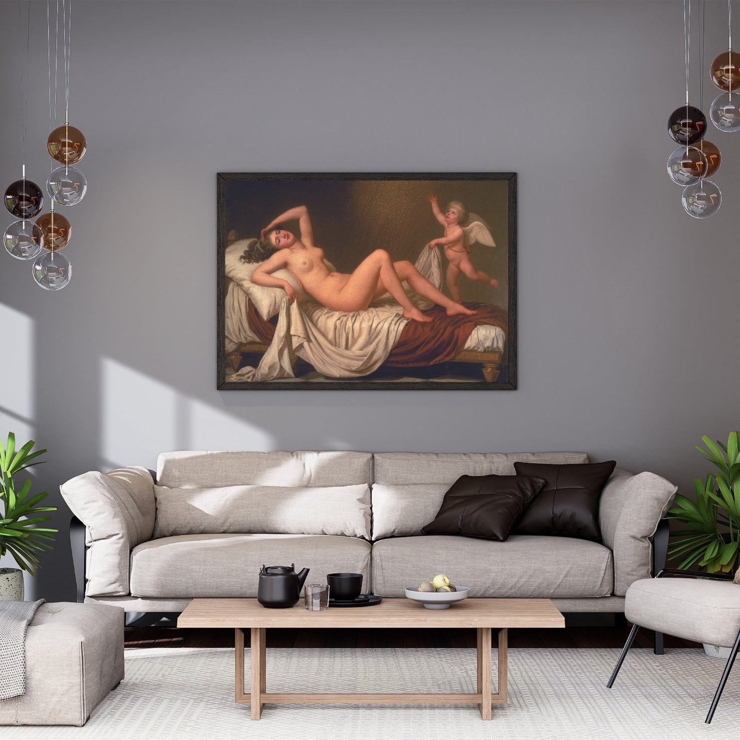 Danaë and the Shower of Gold is a painting by Swedish artist Adolf Ulrik Wertmüller, completed in 1787. The artwork portrays the mythological story of Danaë, who was visited by Zeus in the form of a shower of gold. In the painting, Danaë is depicted lying on a bed, with golden raindrops descending upon her, symbolizing Zeus's divine presence. Cupid is also present, guiding the shower of gold towards Danaë. The painting is a beautiful representation of the myth and showcases Wertmüller's skill in capturing both the divine and human elements of the story. This painting is currently housed in the National Museum of Fine Arts in Stockholm, Sweden.