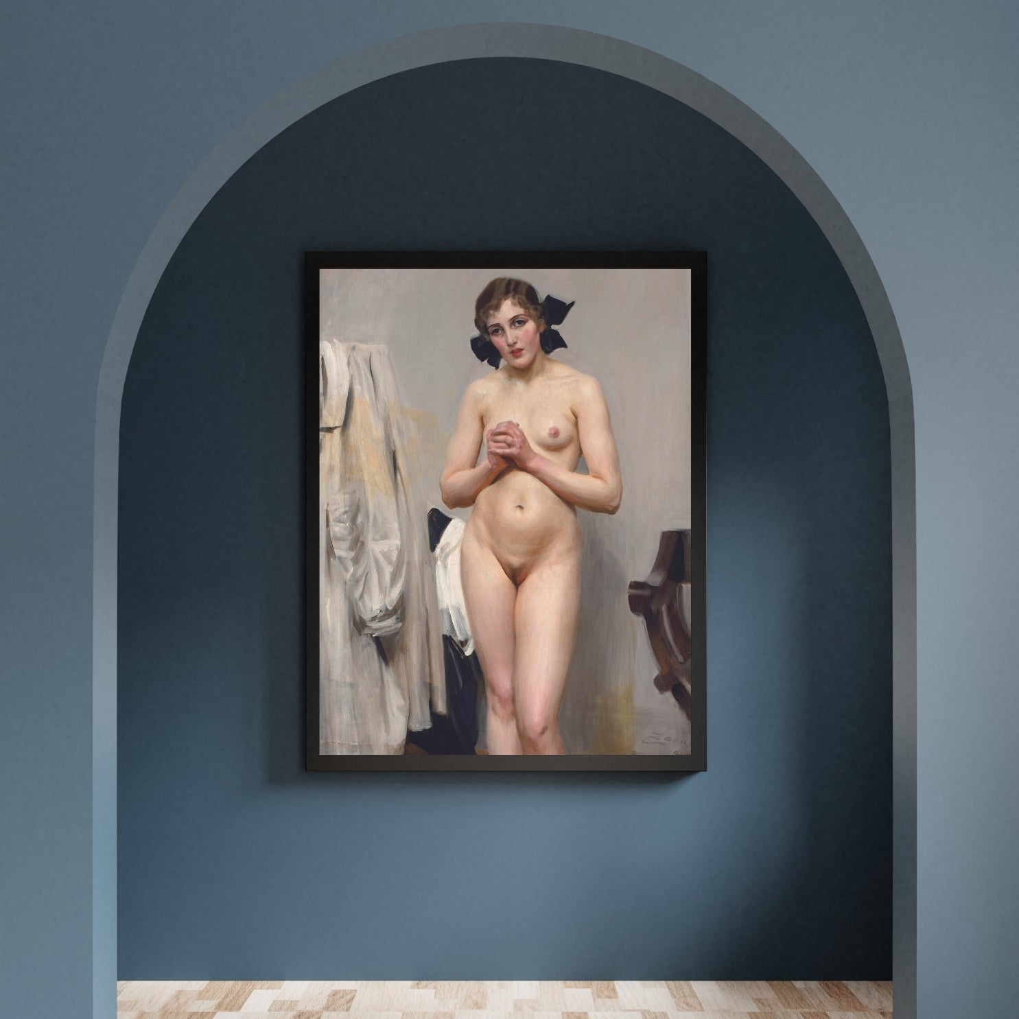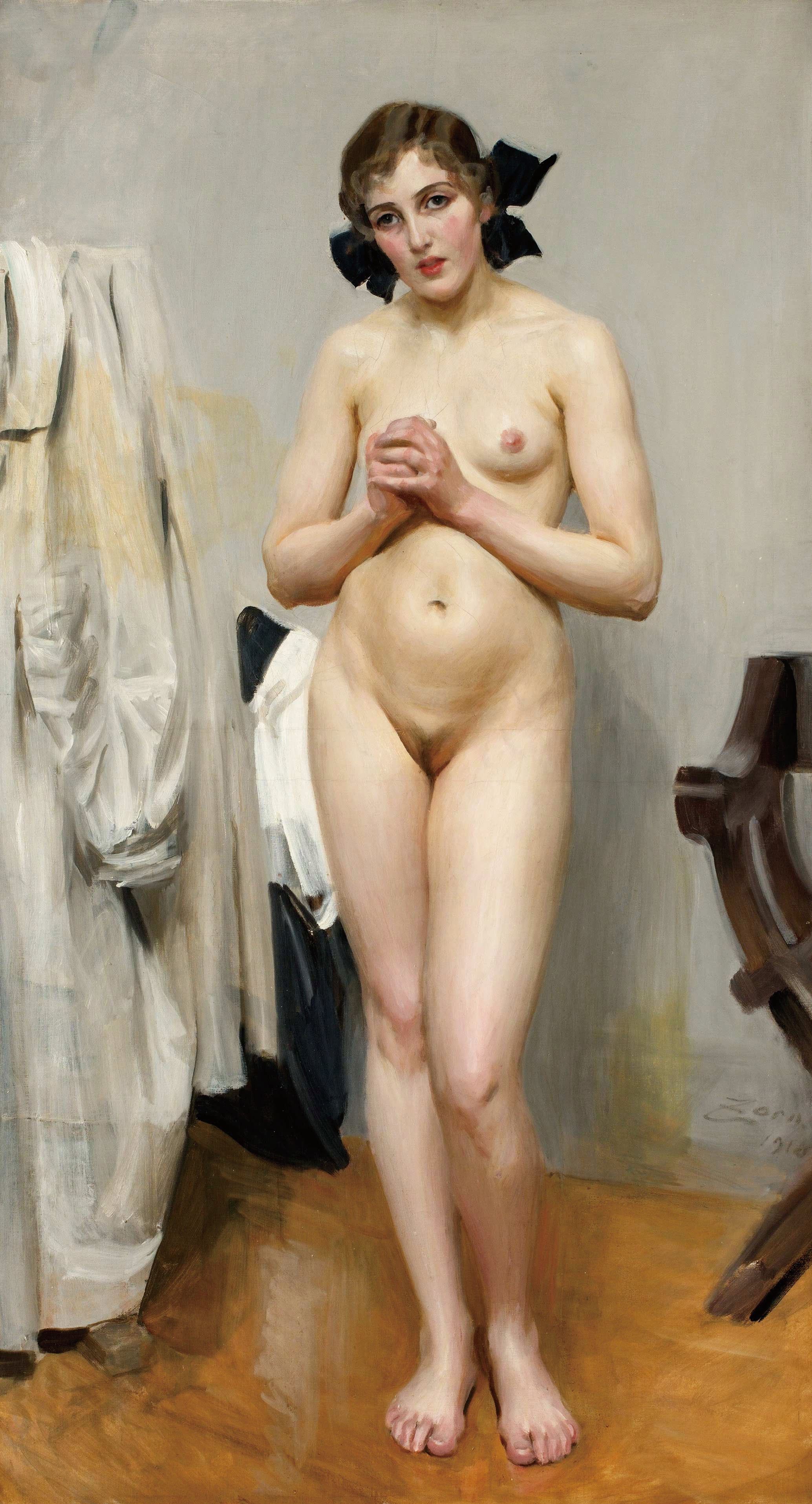 "Fjorton år tror jag visst att jag var" by Anders Zorn, painted in 1886, translates to "I think I was fourteen years old." This artwork by the Swedish master Anders Zorn captures a young girl in a moment of reflection. Known for his ability to convey emotion and character through his subjects, Zorn's work here is no exception. The painting showcases Zorn's exceptional skill in rendering textures and light, bringing a lifelike quality to the girl's contemplative expression. This piece is a fine example of Zorn's realist style and his talent for creating intimate, evocative portraits.