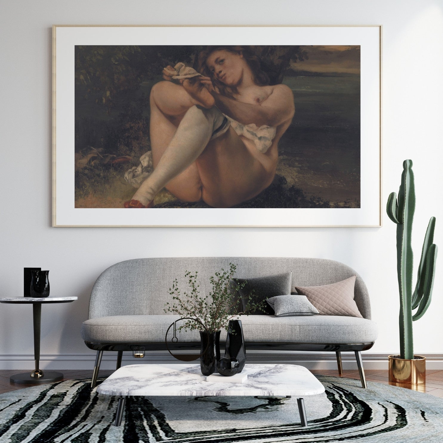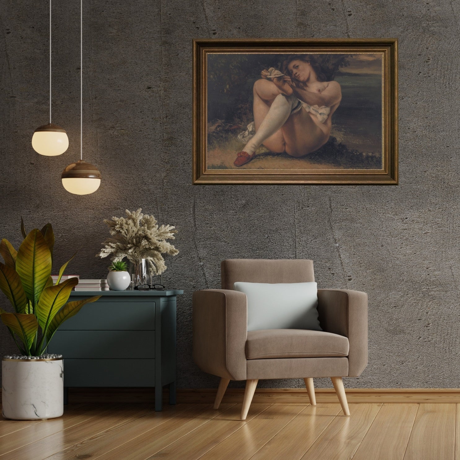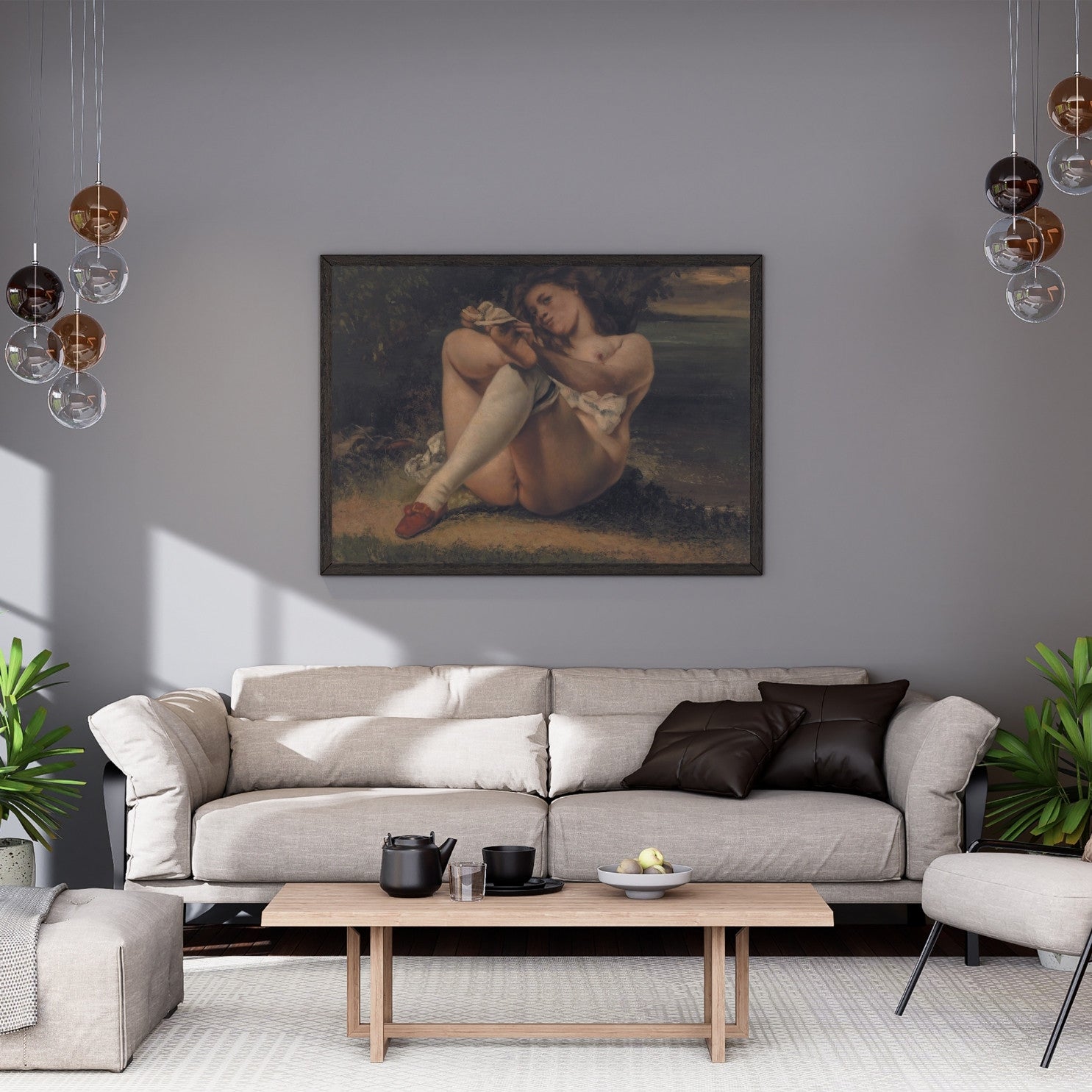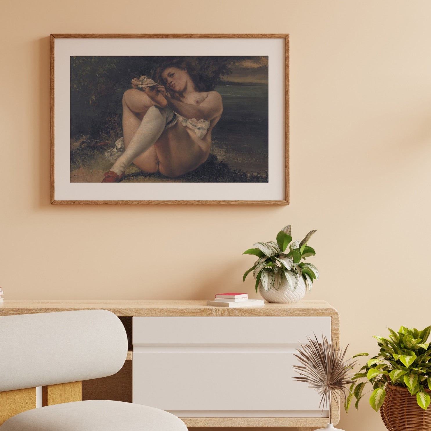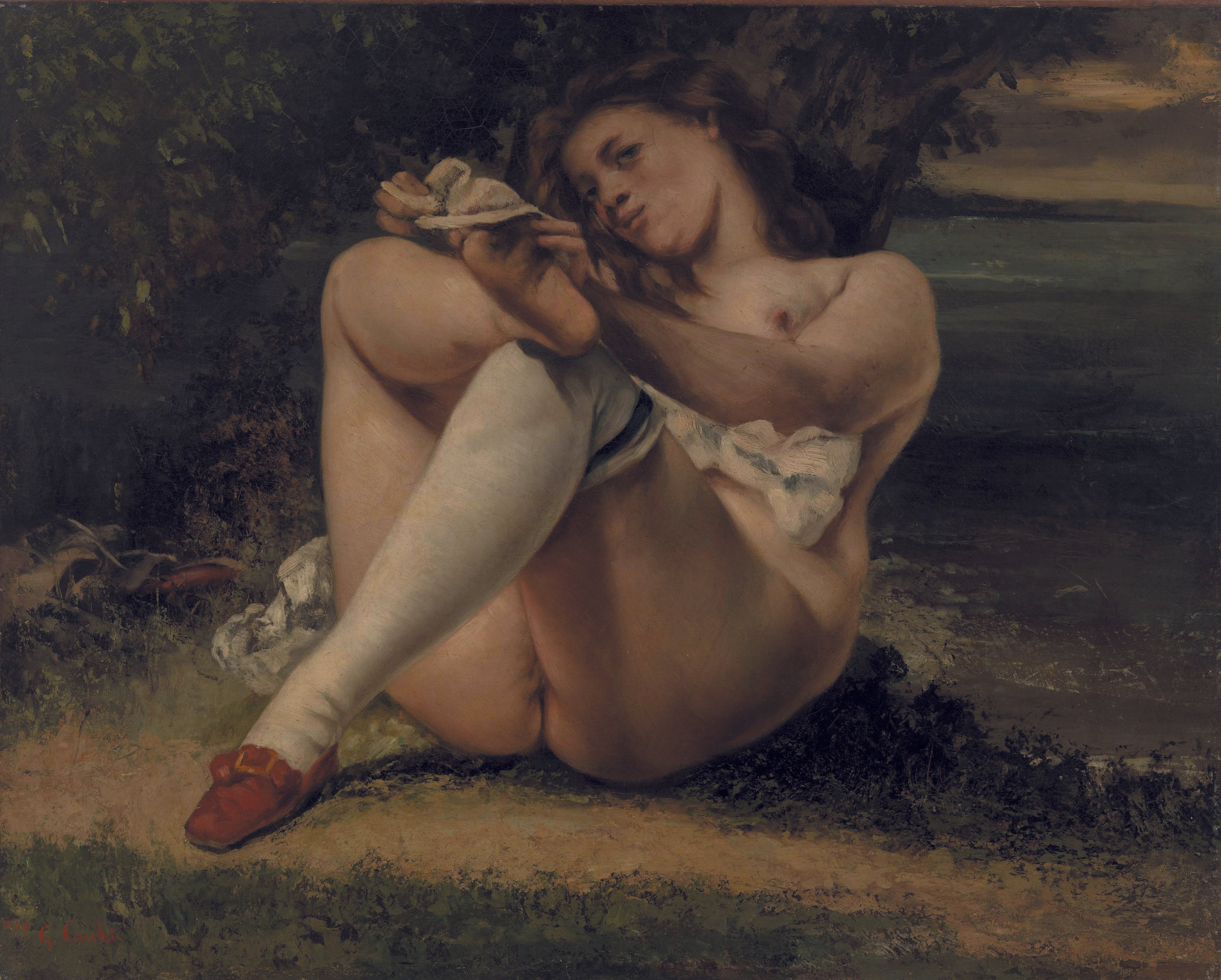 Woman with White Stockings" by Gustave Courbet, created in 1864, is a notable example of the artist's realist approach. This painting features a woman in a suggestive pose, highlighting Courbet's interest in the human form and his break from traditional academic standards. The detailed rendering of the white stockings and the naturalistic depiction of the woman's body emphasize Courbet's commitment to realism. The work captures a candid, intimate moment, reflecting Courbet's focus on portraying everyday life and people with honesty and authenticity. "Woman with White Stockings" stands as a testament to Courbet's influence on the realism movement and his challenge to conventional artistic norms.