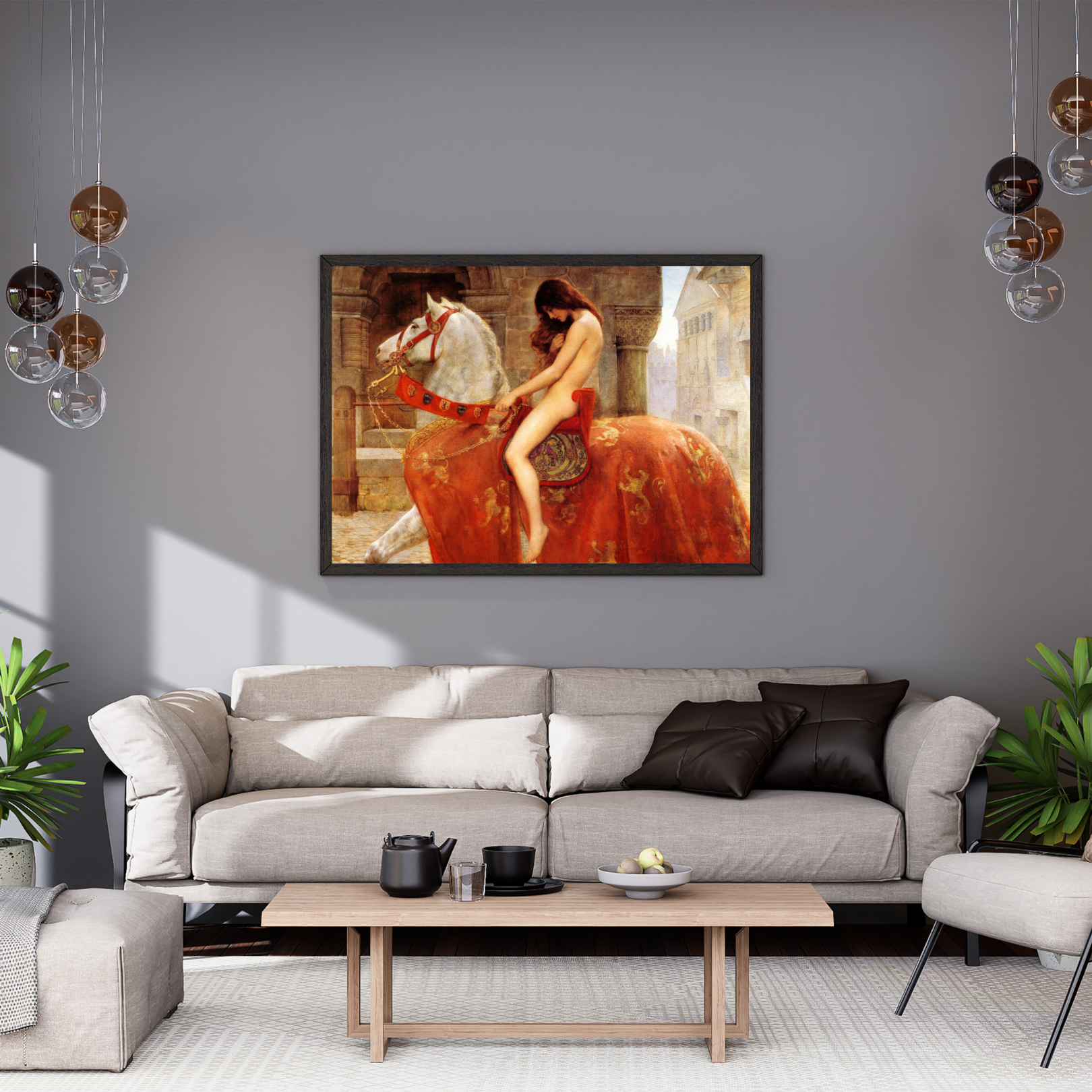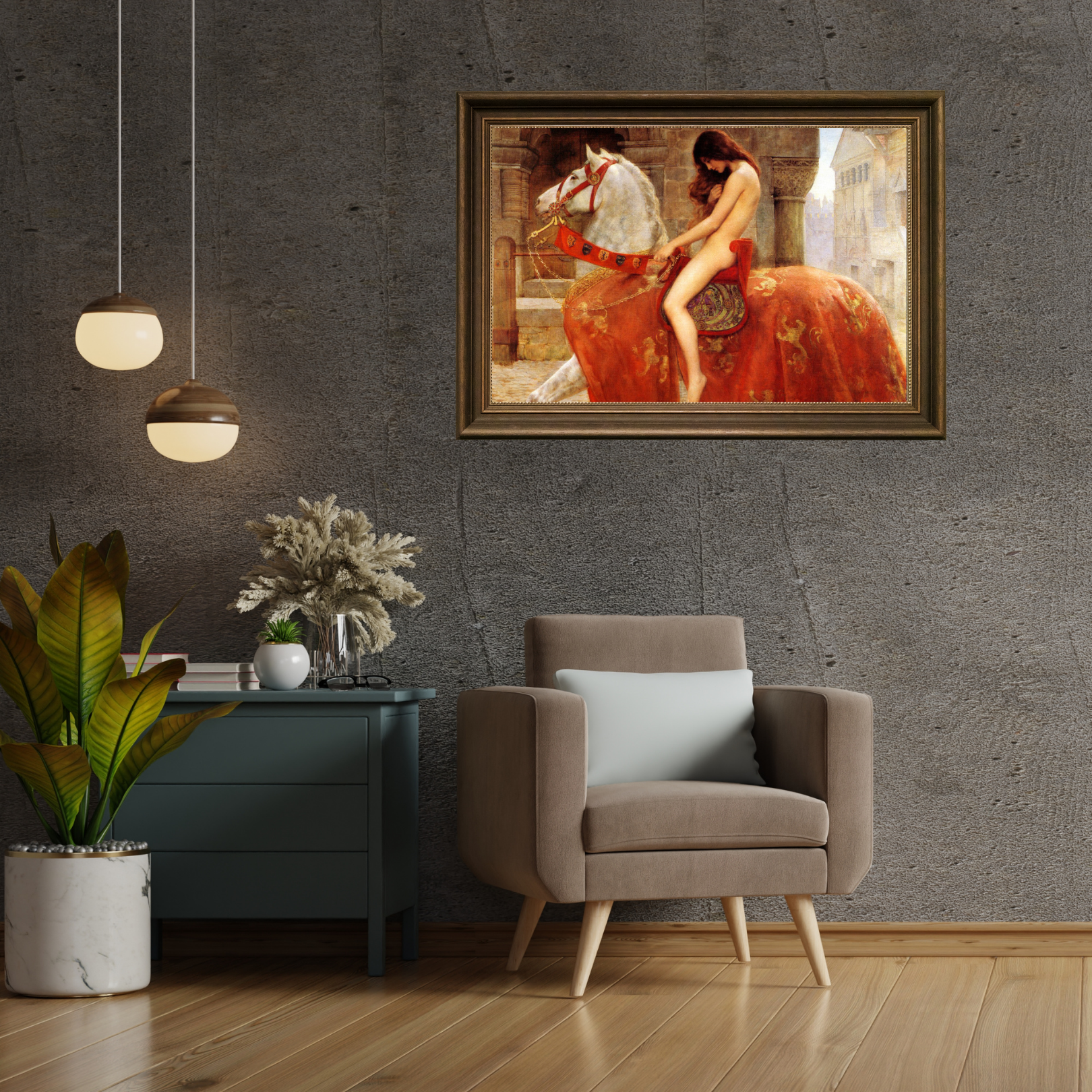 "Lady Godiva" is a painting by English artist John Collier, completed in 1898. The painting depicts Lady Godiva, an 11th century noblewoman, riding a white horse while wearing only her long hair as a covering. The painting is a representation of the legend of Lady Godiva, who supposedly rode naked through the streets of Coventry in order to persuade her husband, the Earl of Mercia, to lower the taxes on the town's citizens. Collier's painting captures the beauty and bravery of Lady Godiva, and has become an iconic representation of the legend.