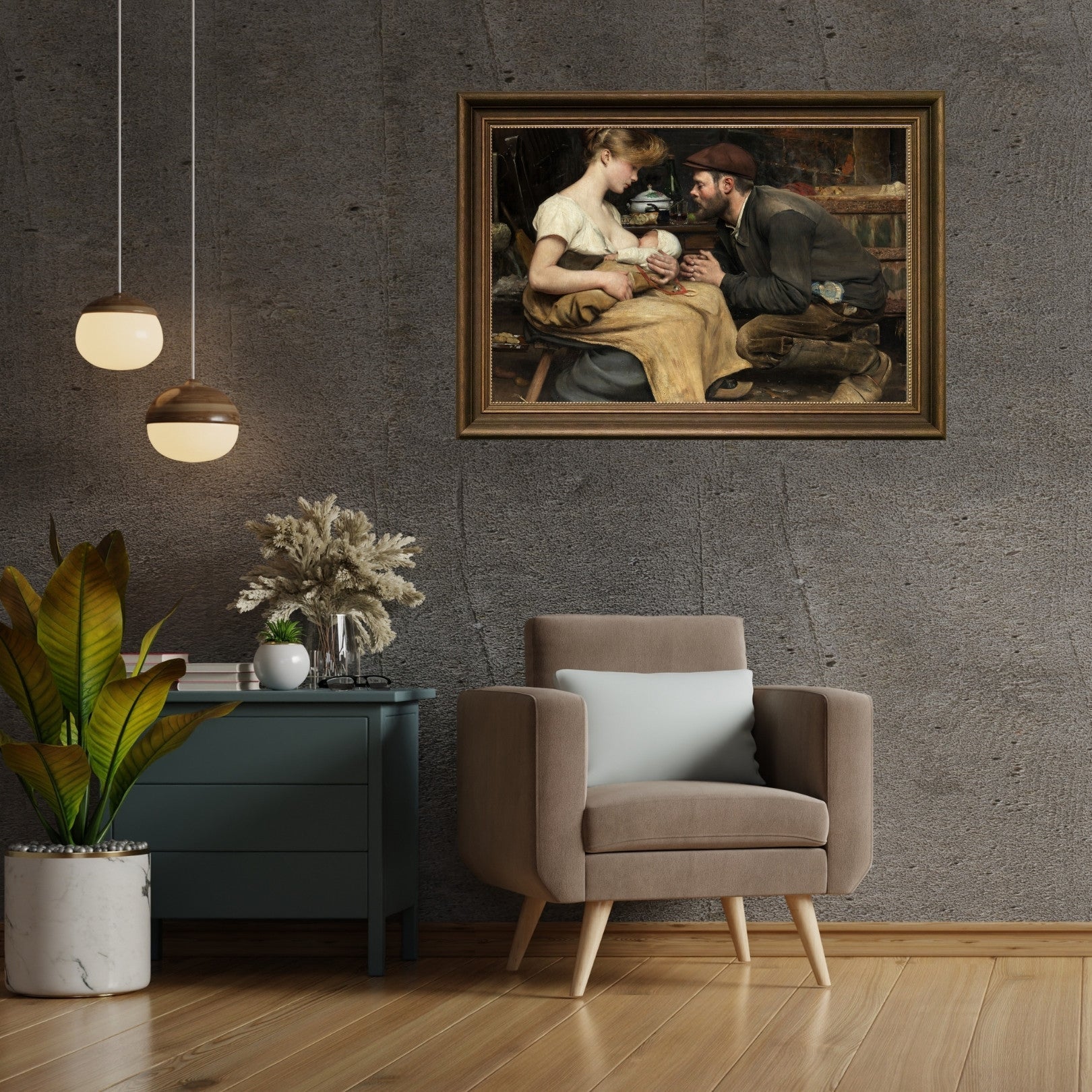 Parents' Happiness (Bonheur des parents) by Jean-Eugène Buland is a touching depiction of family joy and the simple pleasures of everyday life. Painted in 1903, this artwork captures a serene domestic scene where parents are lovingly engaged with their children. Buland's realist approach brings out the emotional depth and warmth of the family bond, emphasizing the happiness found in parenthood. The intricate details and the natural lighting in the painting highlight the artist's skill in portraying the nuances of human relationships and the peaceful ambiance of a family home.
