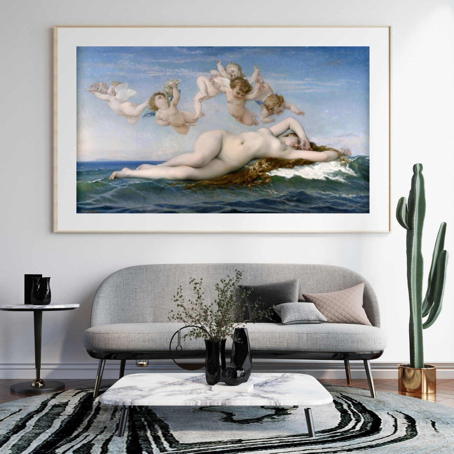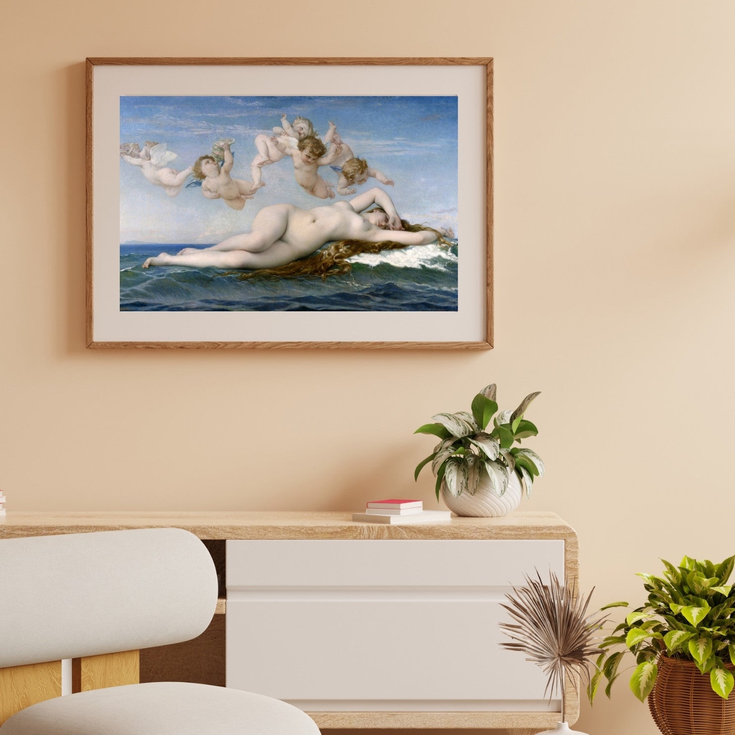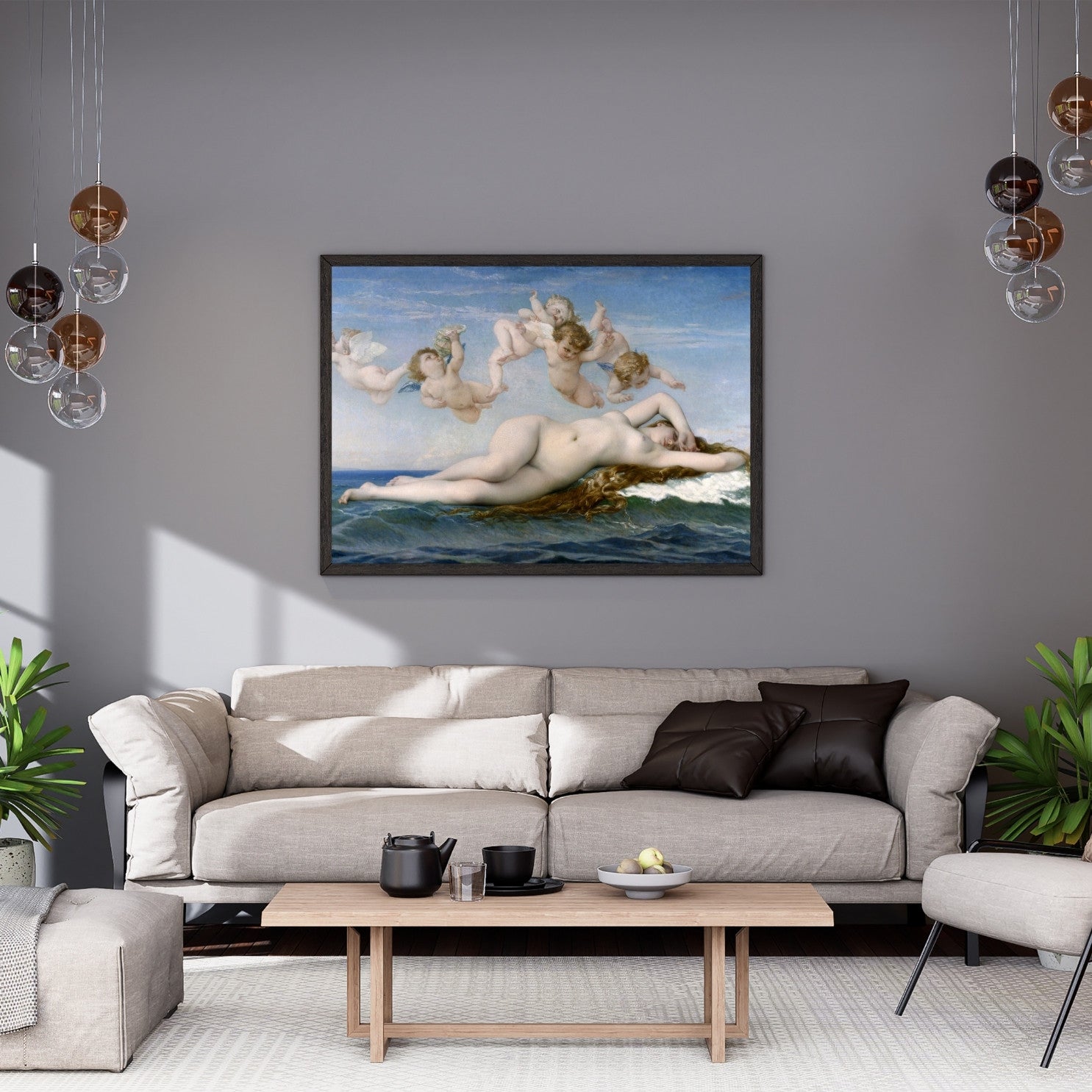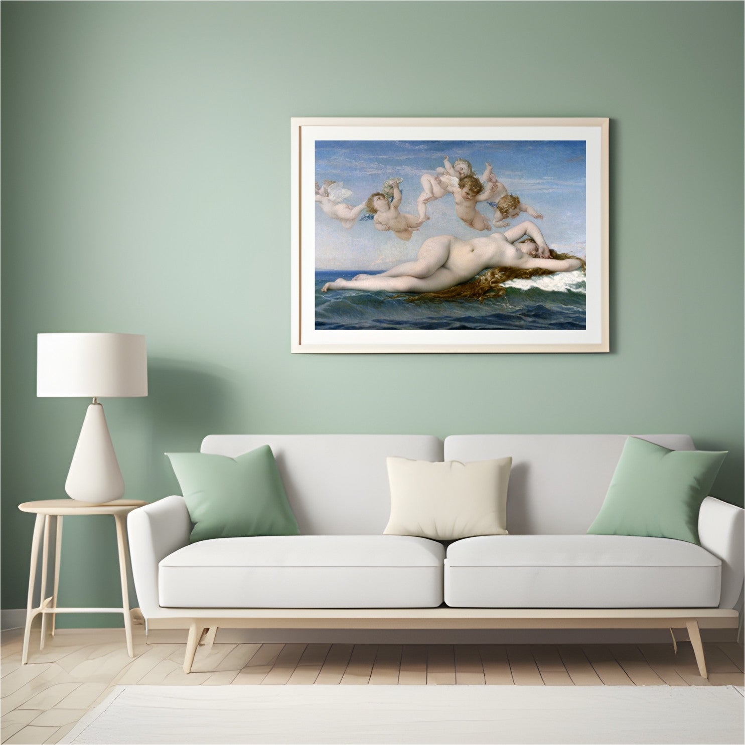 "The Birth of Venus" by Alexandre Cabanel, completed in 1863, is a renowned masterpiece that epitomizes the academic style of 19th-century French painting. This exquisite artwork depicts the goddess Venus emerging from the sea, lying on a wave and surrounded by cherubs. Cabanel's portrayal of Venus is both sensual and ethereal, embodying the idealized beauty of classical mythology. The painting's delicate color palette, meticulous attention to detail, and soft, flowing lines highlight Cabanel's technical mastery and artistic finesse. This piece, celebrated for its grace and elegance, captivated audiences at the Salon of 1863 and remains a quintessential representation of mythological art.