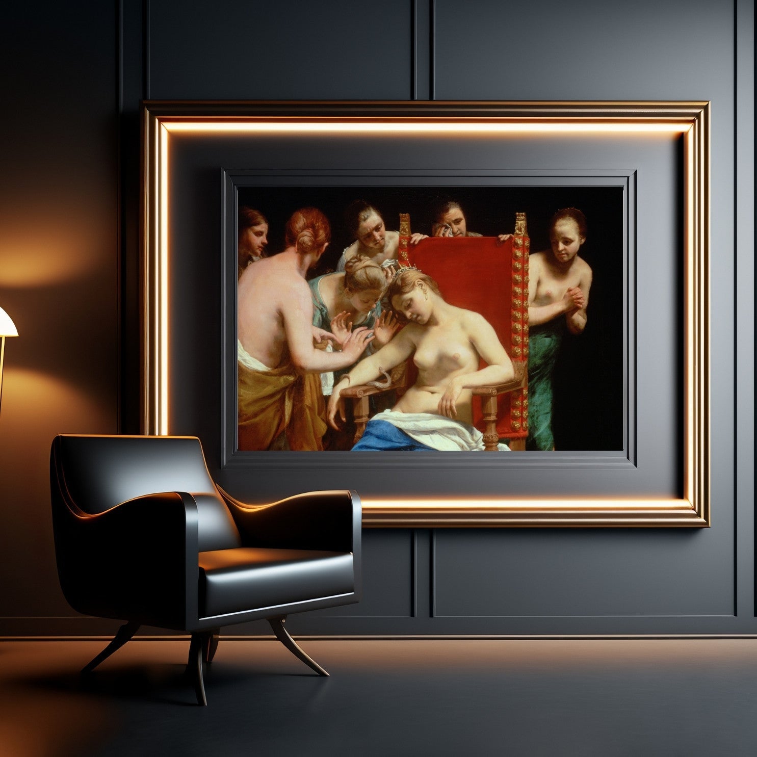 "The Death of Cleopatra" by Guido Cagnacci, painted in 1658, vividly captures the dramatic and tragic end of the legendary Egyptian queen, Cleopatra. Known for his emotional intensity and meticulous detail, Cagnacci portrays Cleopatra in her final moments after being bitten by a venomous asp. The painting is a powerful depiction of beauty intertwined with tragedy, as Cleopatra's serene expression contrasts with the violent act of her suicide. The rich use of color and masterful composition highlight the artist's skill in conveying complex emotions and narratives. This artwork stands as a testament to Cagnacci's ability to blend historical storytelling with his unique artistic vision, making it a captivating piece that continues to evoke strong reactions from viewers.