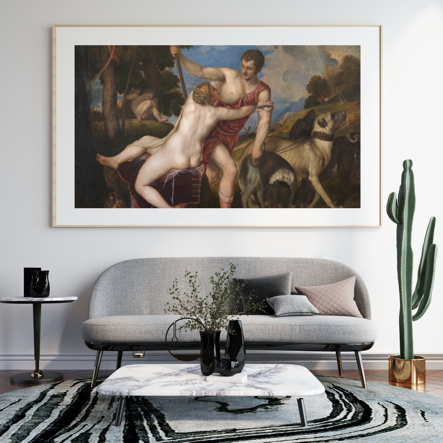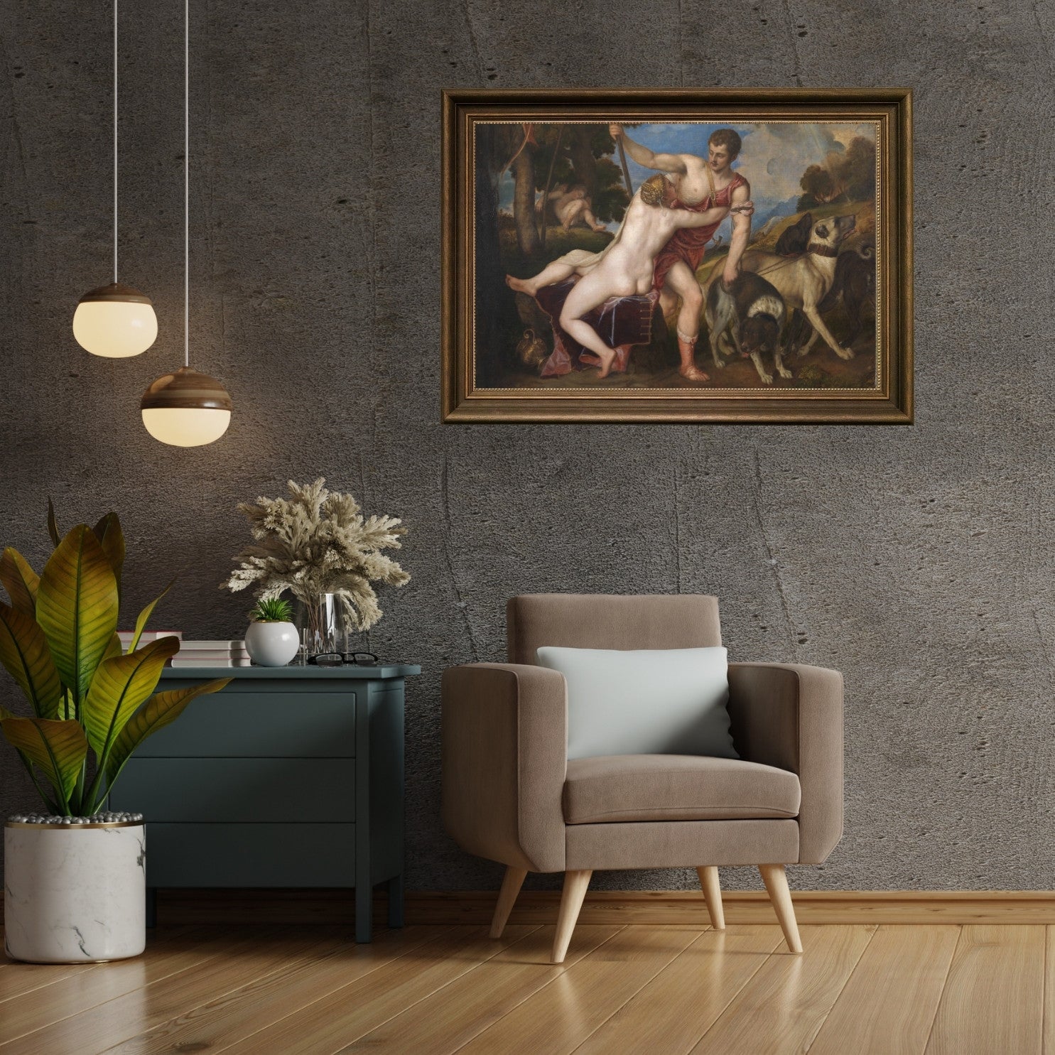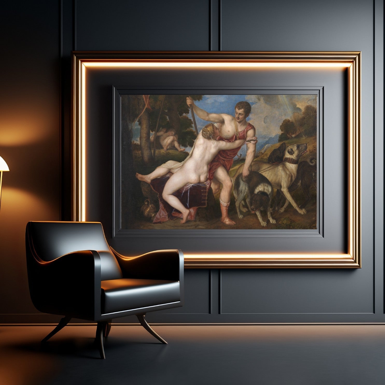 "Venus and Adonis" by the Venetian Renaissance artist Titian, painted around 1554, is a captivating depiction of the tragic love story from Roman mythology. In this masterpiece, the goddess Venus is shown trying to prevent her mortal lover, Adonis, from going on a hunt that she has foreseen will lead to his death. The painting captures the intense emotional moment with Venus clinging to Adonis, her despair evident, while Adonis seems determined yet tender in his resolve. Titian's use of rich, vibrant colors, dynamic composition, and delicate rendering of figures exemplifies his mastery and the height of Venetian Renaissance art. This poignant work beautifully conveys the themes of love, loss, and destiny.
